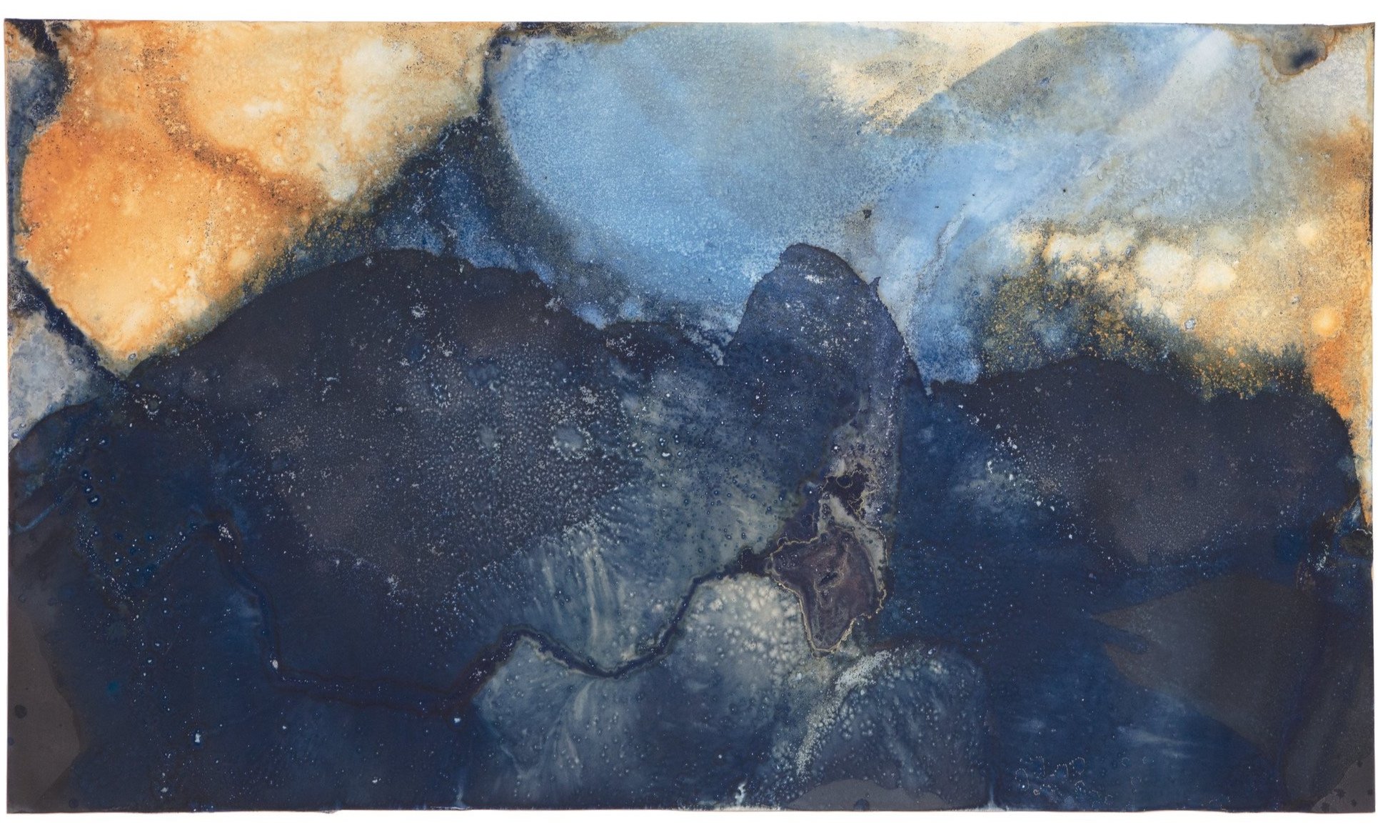 Meghann Riepenhoff, Littoral Drift #1184 (Roaring Fork River, CO 08.01.19, Draped on Boulder, Swirling Eddies), 2019, dynamic cyanotype hinged to museum board, 24 x 42 in, unique, signed in pencil verso. Courtesy of the artist and Jackson Fine Art