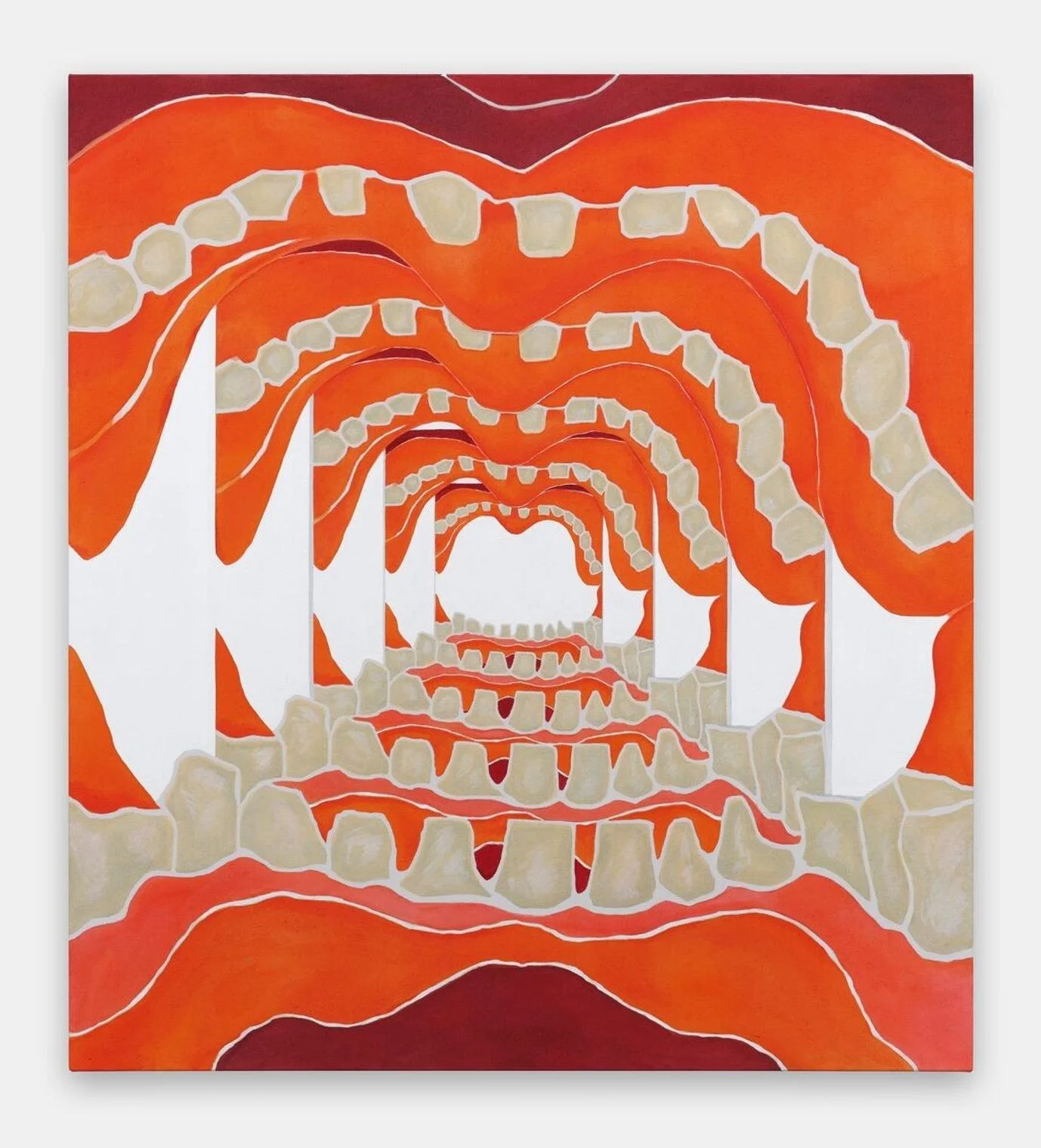 Allison Katz, Eruption, 2024. Acrylic on canvas, 62.625 x 56.75 x 1.375 in. ©Allison Katz. Photo: Eva Herzog